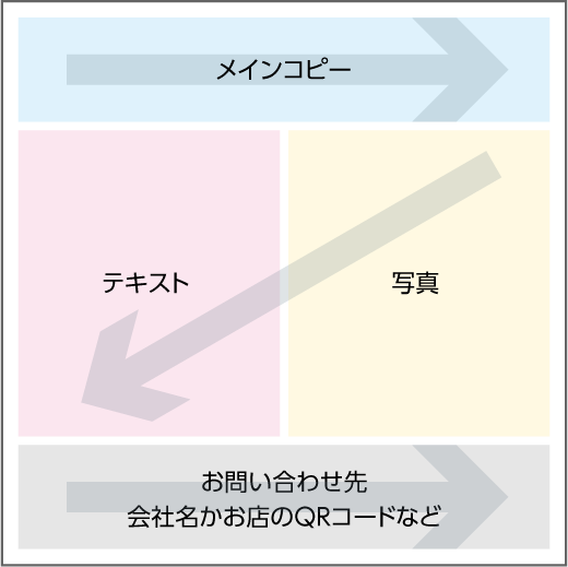 左上が1番最初に見られることが多いので最も伝えたい情報は左上に配置します。最後に右下で視線が止まるので、「お問合せ先」「会社やお店のQRコード」など、見た人の行動を促すような情報を右下に入れることをお勧めします。